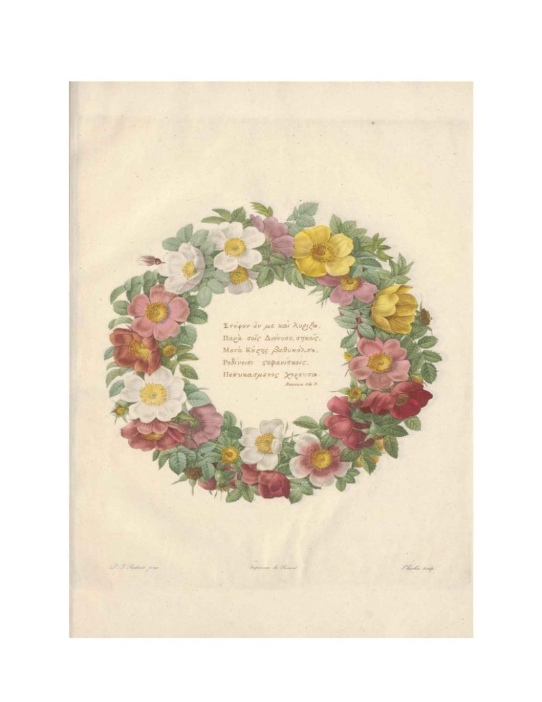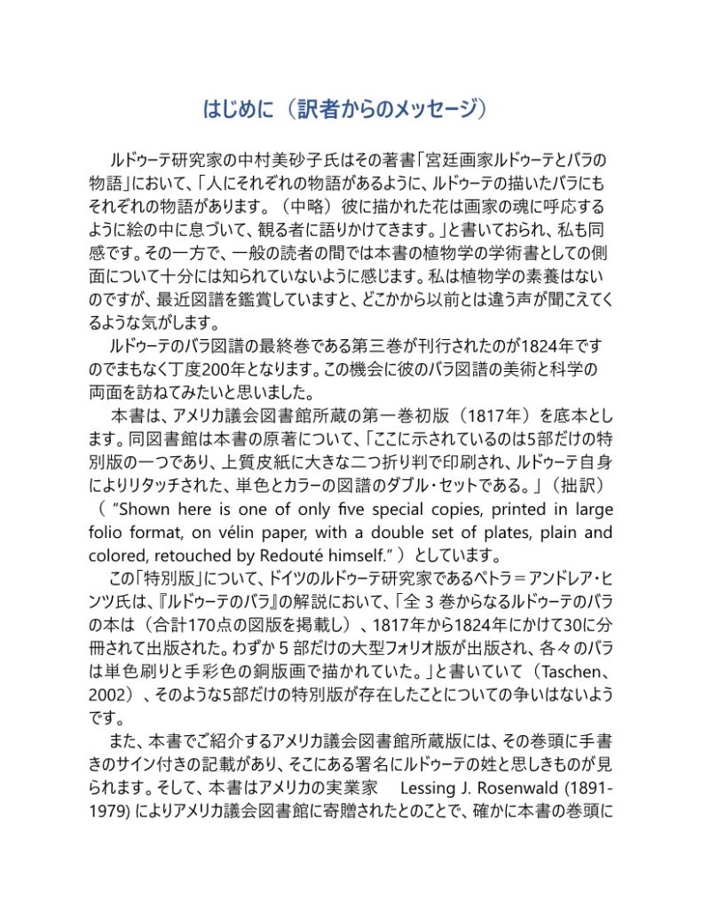 ルドゥーテのバラ図譜の最終巻である第三巻が刊行されたのが1824年ですのでまもなく丁度200年となります。本書はアメリカ議会図書館所蔵の第一巻初版(1817年)を底本とし、すべての図譜(扉絵の花輪と原著番号1~56)の単色とカラーの両方を再録しました。 また発行目的が書かれているその序文 (Avant-Propos) の原文を復刻し、その日本語参考訳を付しました。そして文献一覧(原語のみ)とそれに付された注意書き(日本語参考訳付き)も含めました。更に原著の巻末にある大変興味深い註補を同様にフランス語、日本語で紹介しました。(例えば扉絵の花輪の中に書かれたギリシャ語の詩の紹介があります。)
