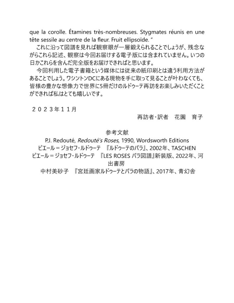 「序文」「バラ植物学⽂献一覧」付き 2023年11月1日発行 電子版(239頁) 定価 950円(税込み)